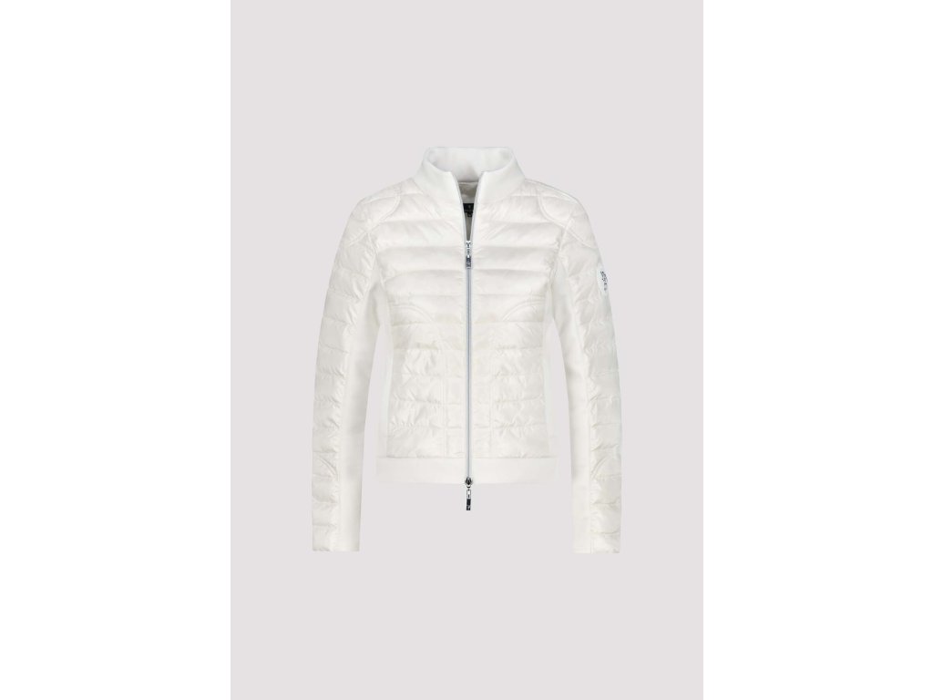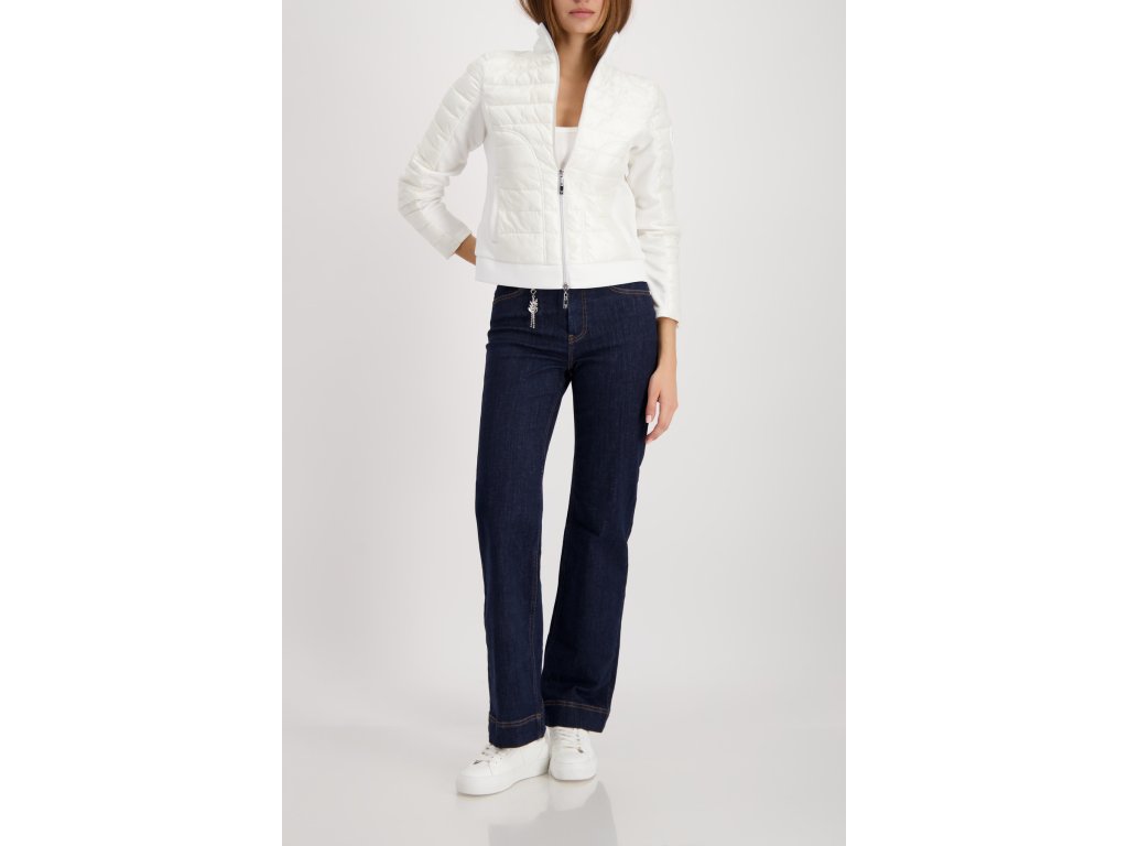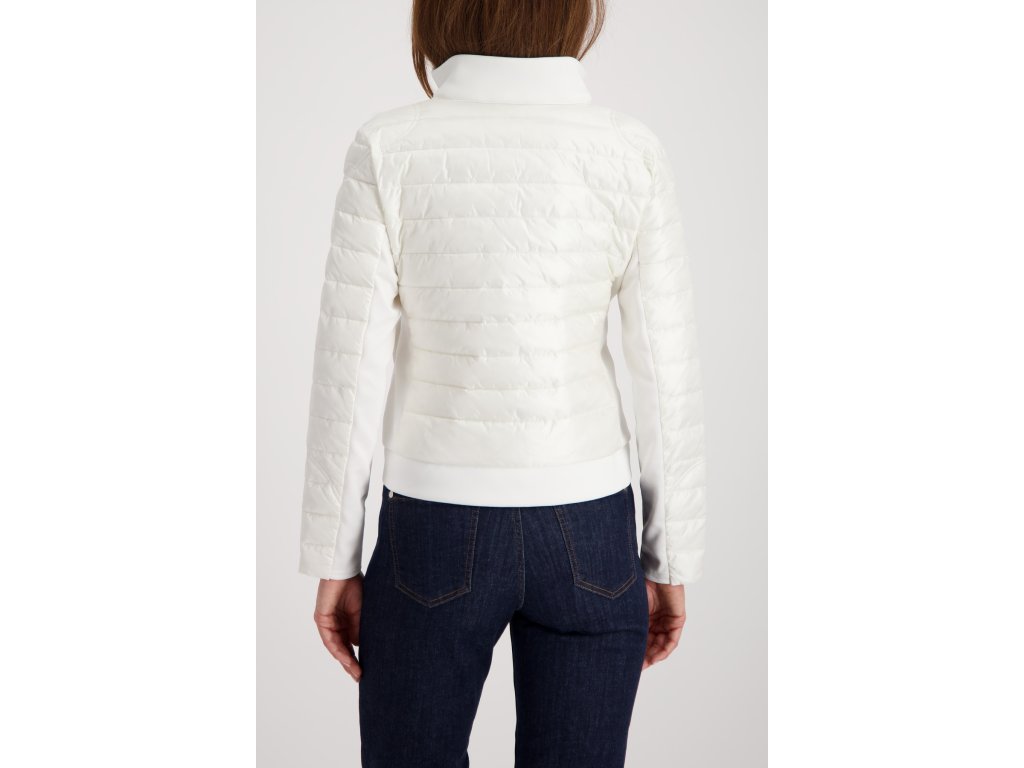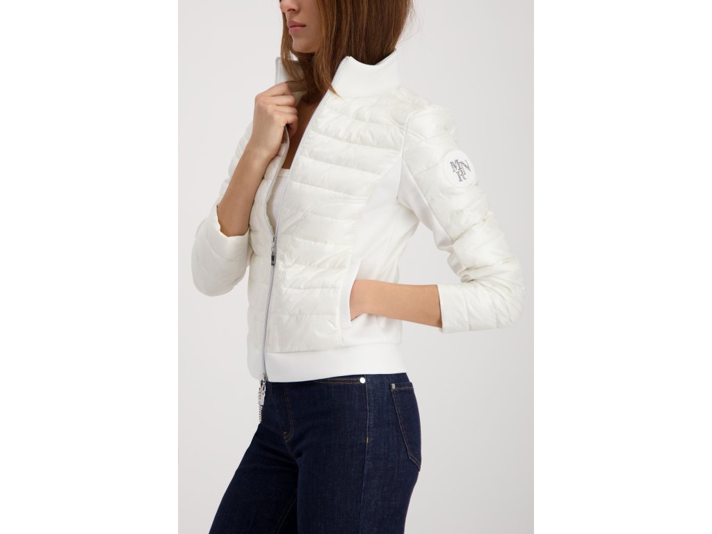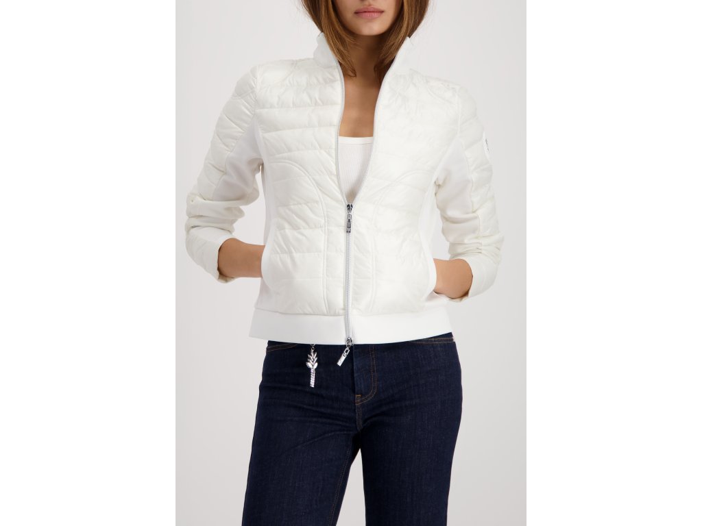 Oživte svůj šatník touto nádhernou bundou značky Monari v barvě off-white. Model vyniká chytrým spojením dvou materiálů: prošívaná přední část s jemným leskem působí elegantně a chrání před větrem, zatímco boky a rukávy z pružného úpletu zajišťují maximální komfort a volnost pohybu. Tento střih navíc krásně kopíruje postavu a opticky ji zeštíhluje. Luxusní vzhled podtrhuje výrazný stříbrný dvoucestný zip s ozdobným táhlem a stylové gumové logo na levém rukávu. Bunda má praktický stojáček a boční kapsy. Je to ideální kousek pro přechodné období, který vypadá skvěle jak k džínám, tak k elegantnějším kalhotám.