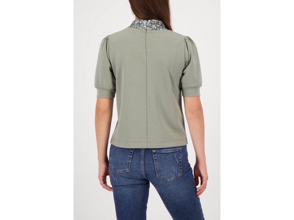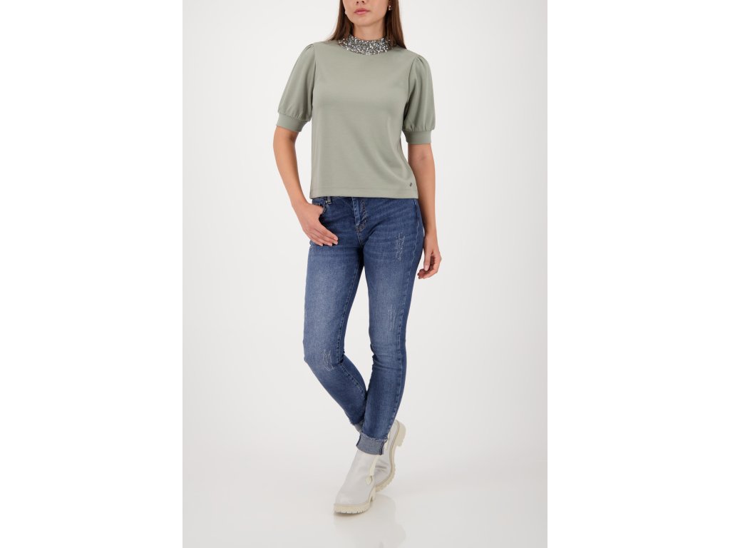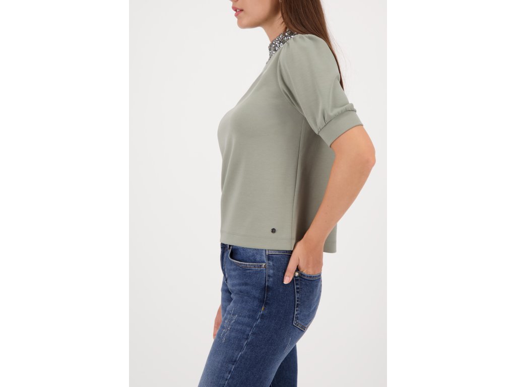 Hledáte šperk, který se nosí? Tato halenka Monari v šalvějové barvě s flitrovým lemem u krku rozzáří váš úsměv a dodá punc luxusu i všednímu dni.