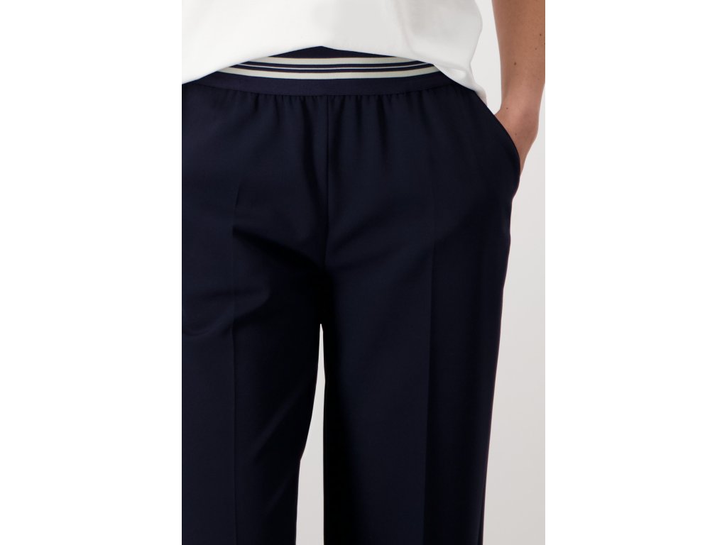 Pohodlí a elegance v jednom! Modré kalhoty Monari s pružným pasem a sportovním proužkem jsou ideální pro volný čas i stylové outfity.