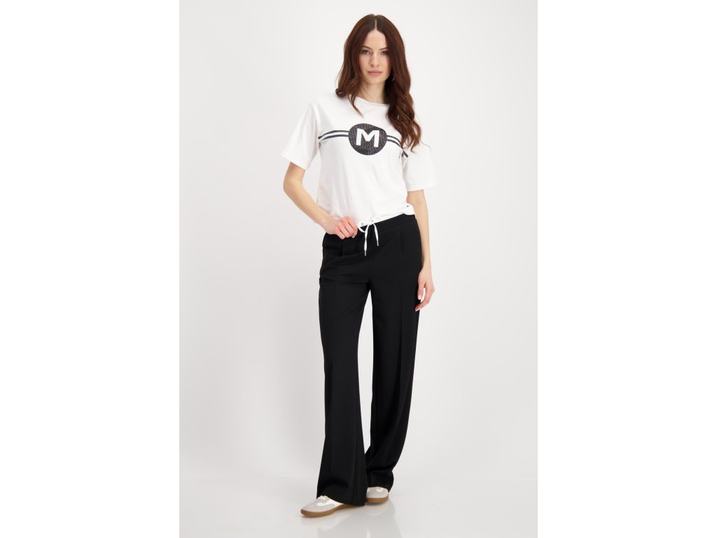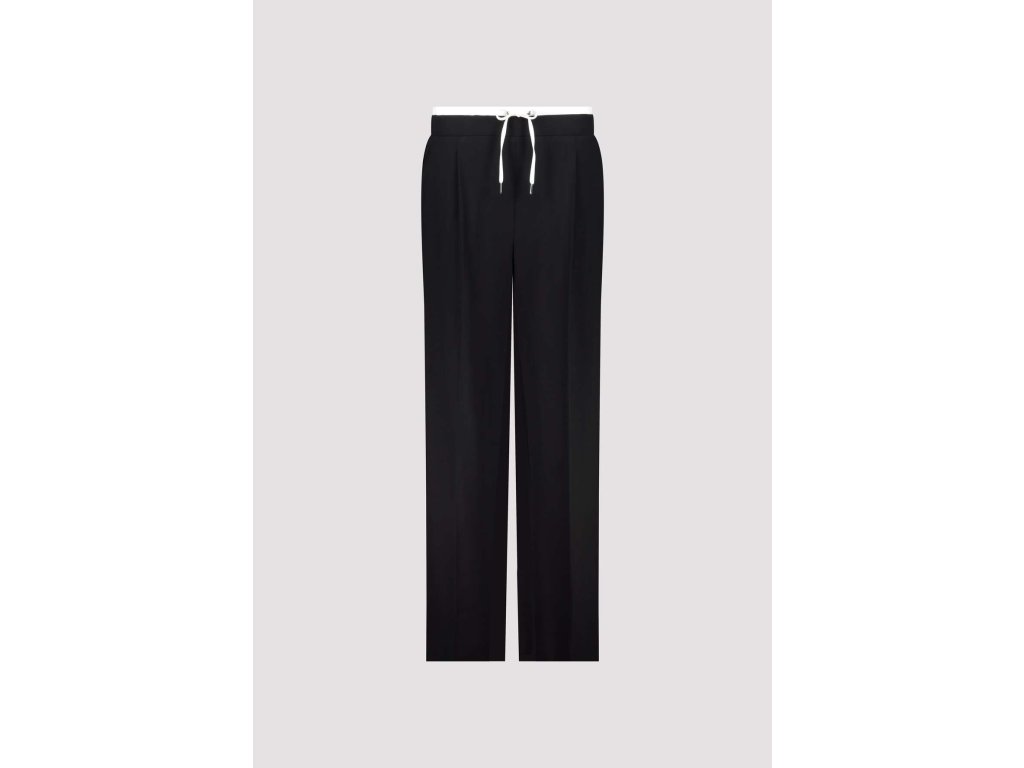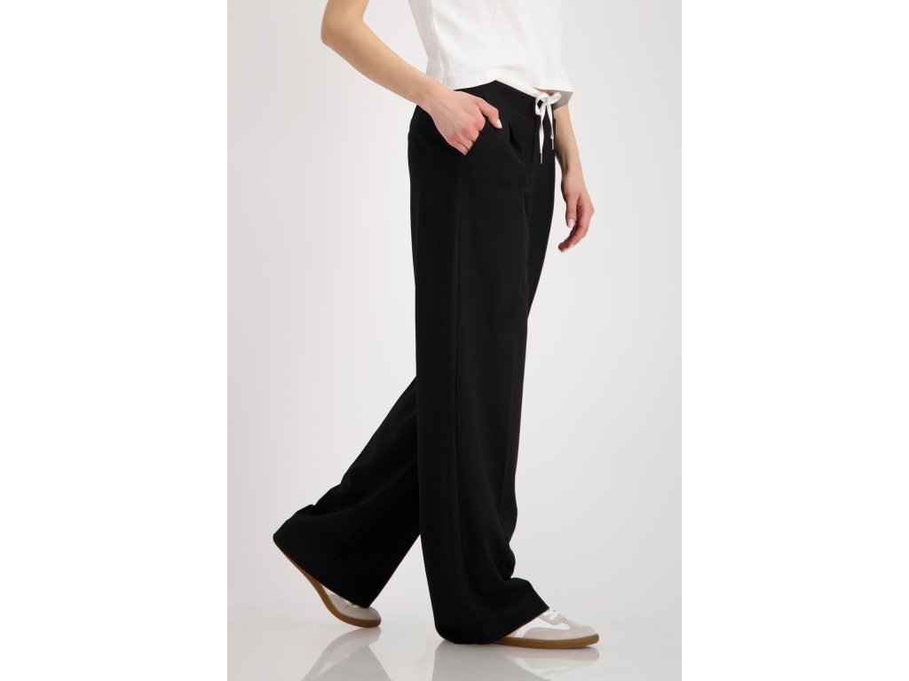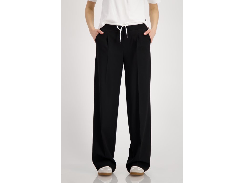 Stylové černé kalhoty značky Monari vynikají volnějším, rovně střiženým nohavicím a komfortním pasem na gumu se šňůrkou pro pohodlné nošení. Lehký a splývavý materiál působí elegantně, zatímco sportovní prvky jako stahování pasu dodávají ležérní nádech. Skvěle se hodí k tričku i halence, ať už míříte do práce, na schůzku nebo si jen užíváte volný den.
