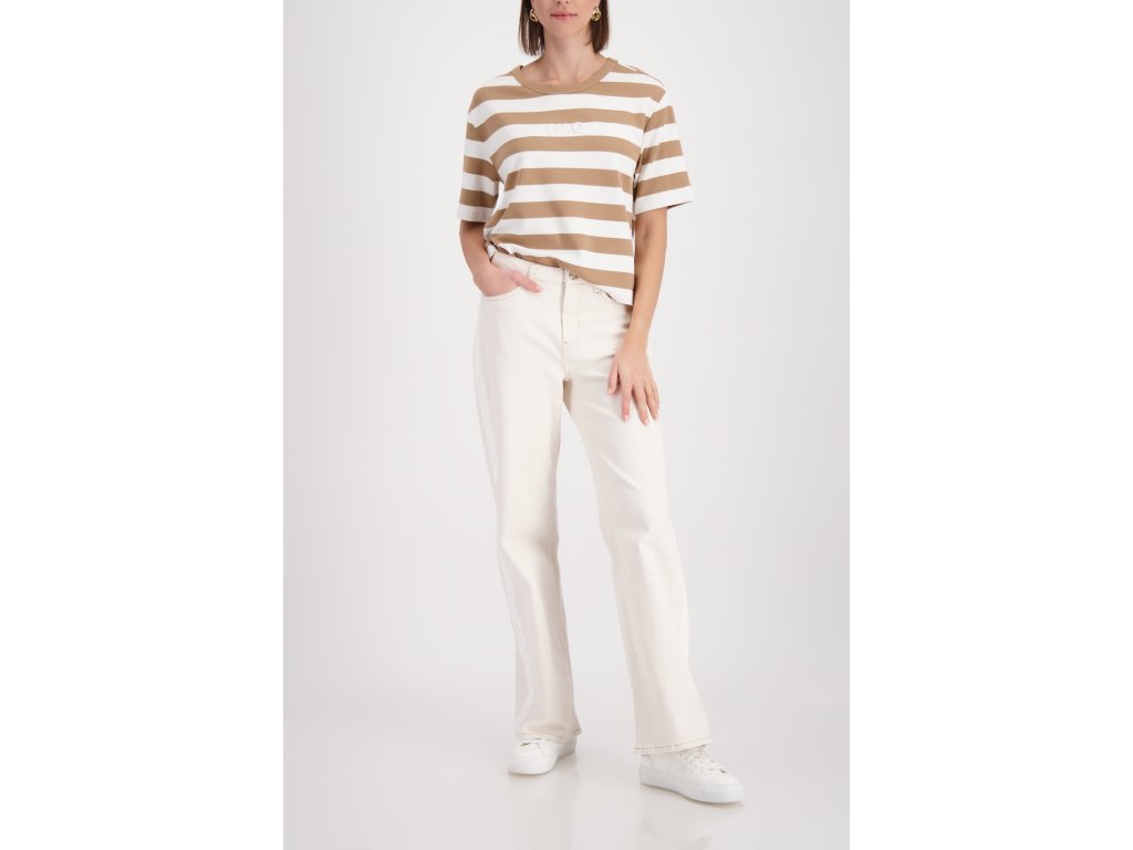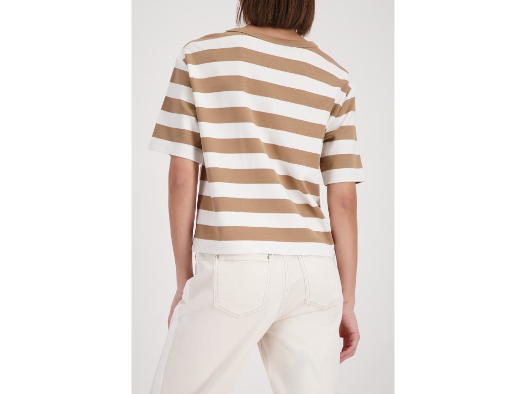 Tahle stylová mikina s krátkým rukávem od značky Monari je přesně ten kousek, po kterém sáhnete, když chcete vypadat skvěle a cítit se v pohodlí. Na první pohled vás upoutá nadčasový vzor širokých béžových a bílých pruhů. Skutečnou třešničkou je ale decentní 3D nápis CIAO na hrudi a drobný kovový detail loga na spodním lemu.