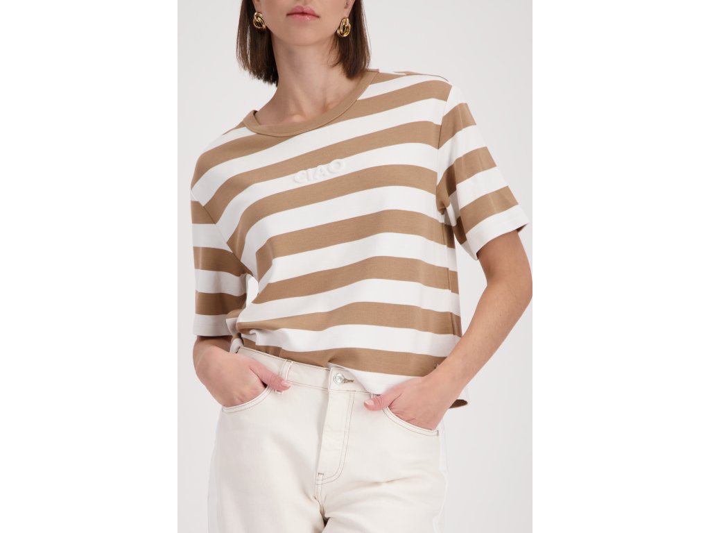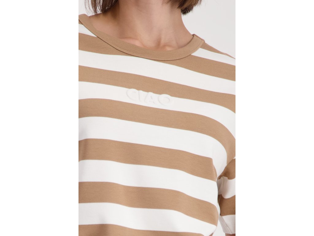 Pruhovaná béžovo-bílá mikina Monari s 3D nápisem CIAO. Příjemný materiál a volnější střih s krátkým rukávem skvěle oživí vaše oblíbené světlé džíny!