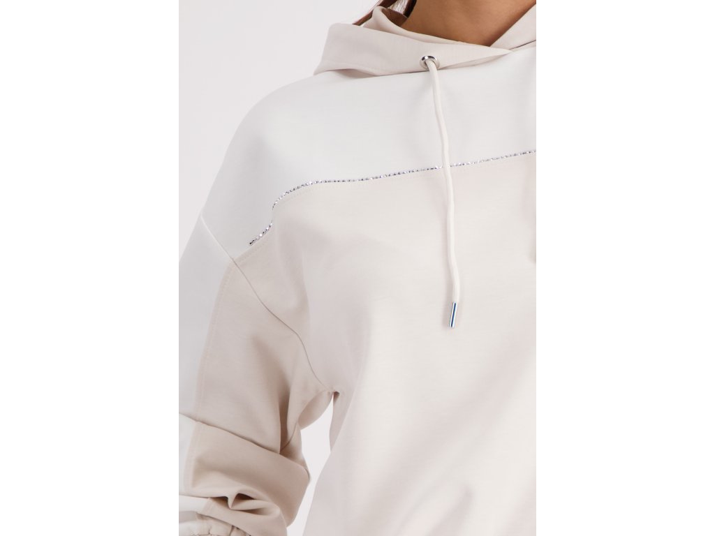 Originálním detailem, který mikinu oživuje, je jemná linka z drobných kamínků táhnoucí se přes hrudník. Nechybí ani klasická kapuce s kovově zakončenými šňůrkami. Mikina je jako stvořená pro stylový relax – oblečte k ní ladící tepláky, obujte čistě bílé tenisky a vyrazte do města i na kávu.