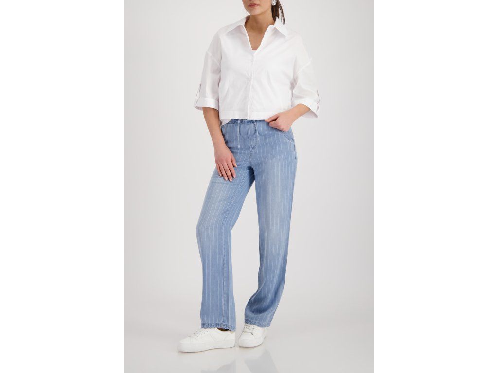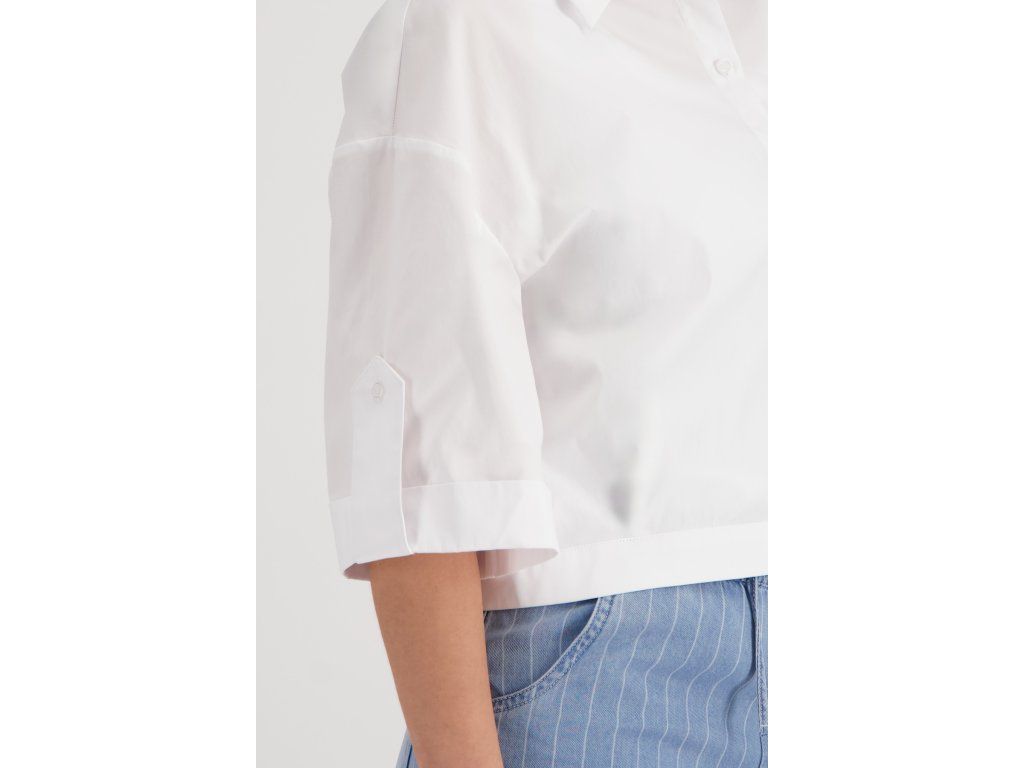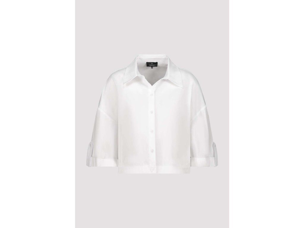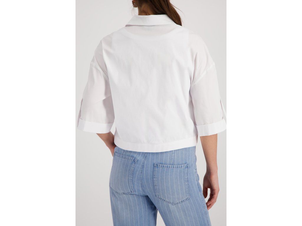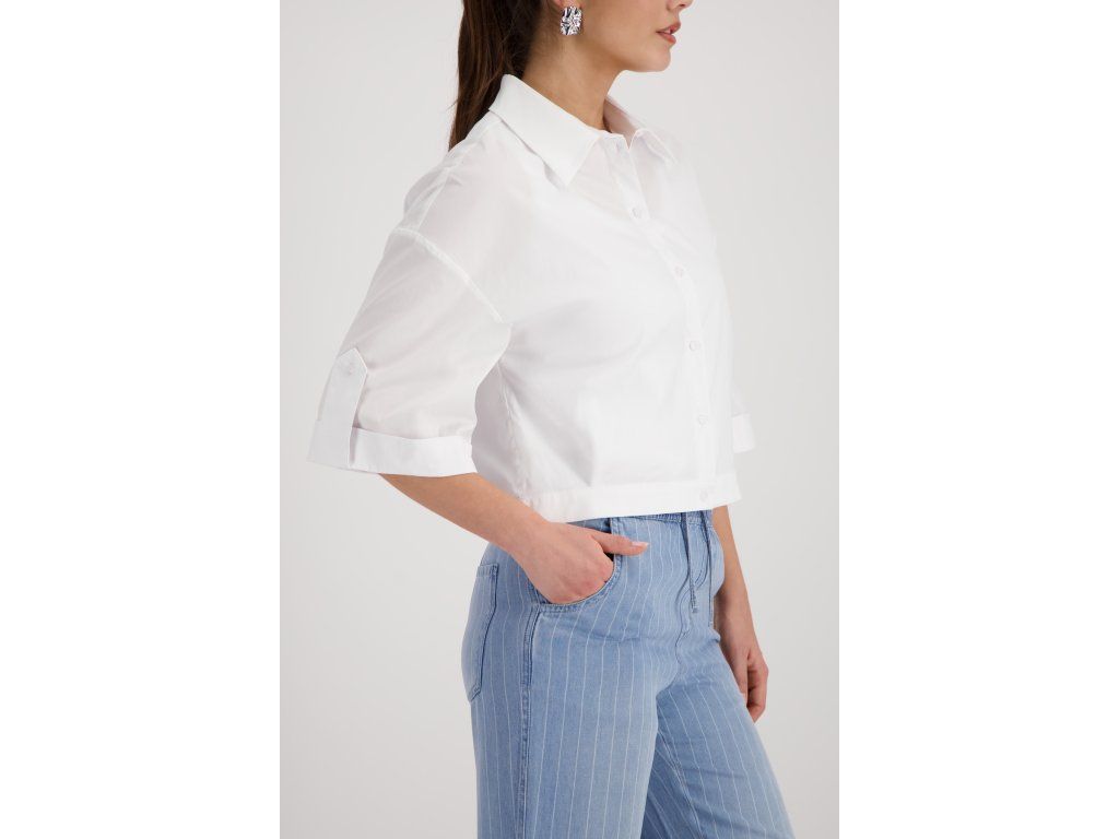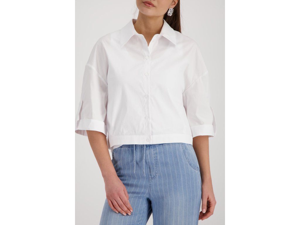 Bílá zkrácená halenka Monari z bavlněného popelínu. Klasický límec, tříčtvrteční rukáv s ohrnutou manžetou.