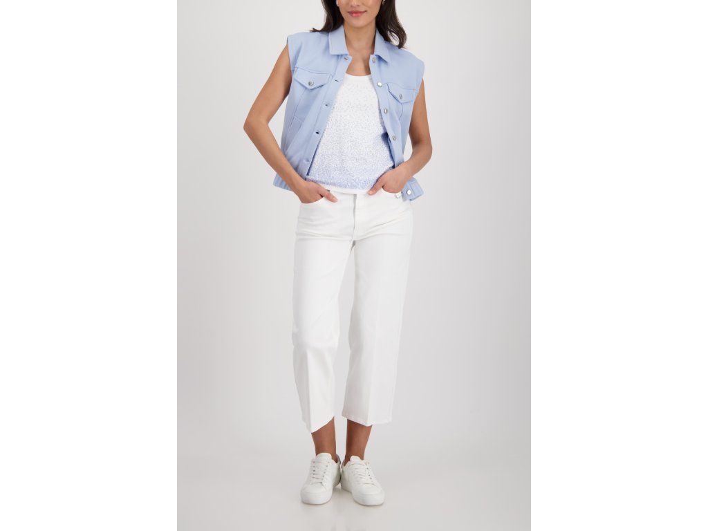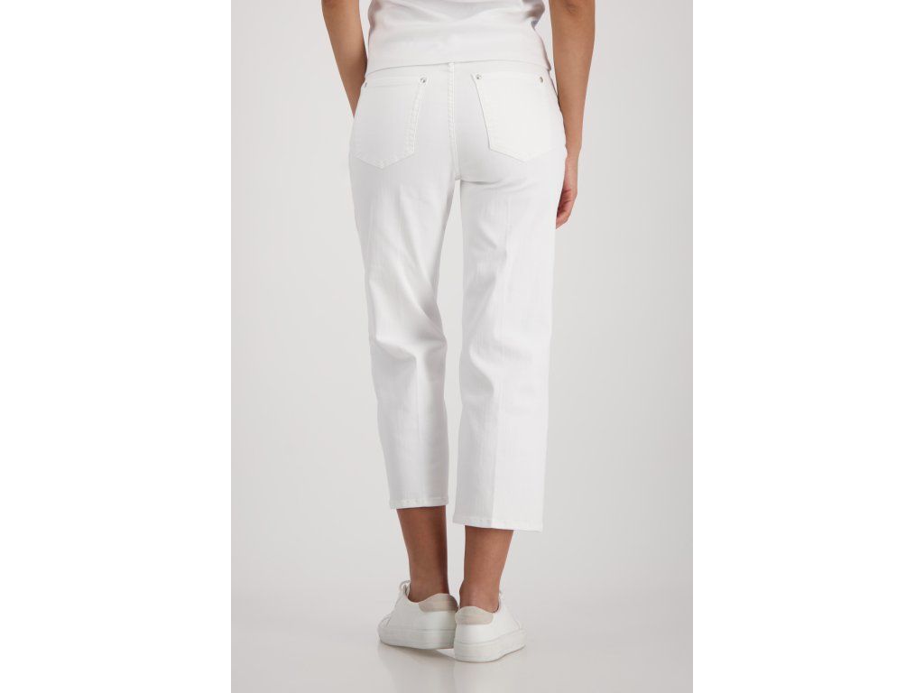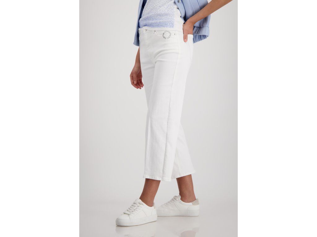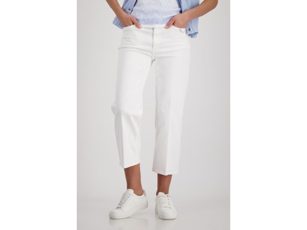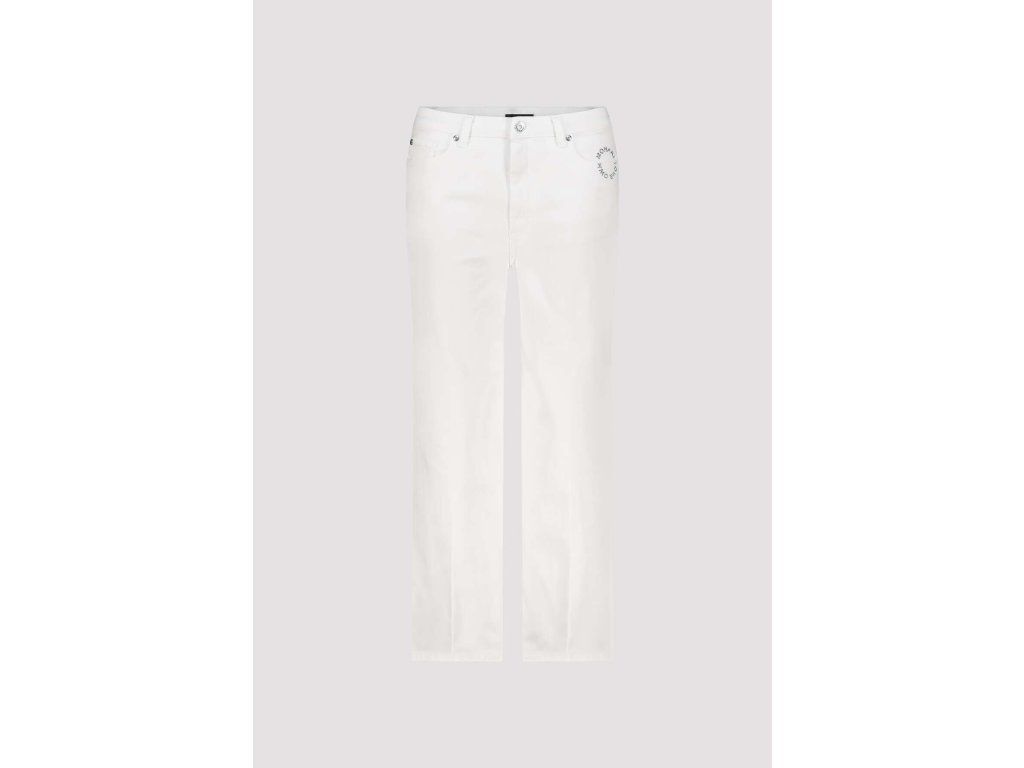 Dámské kalhoty Monari v čisté smetanové barvě jsou střižené do širší nohavice s rovným spadem. Zkrácená délka sahá ke kotníku a opticky prodlužuje postavu. Střih vychází z klasického džínového modelu s pěti kapsami a zipovým zapínáním s knoflíkem.