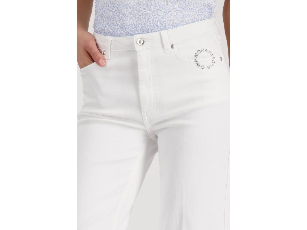 Bílé džínové kalhoty Monari s wide-leg střihem a logem z krystalů u kapsy. Zkrácená délka, pět kapes.