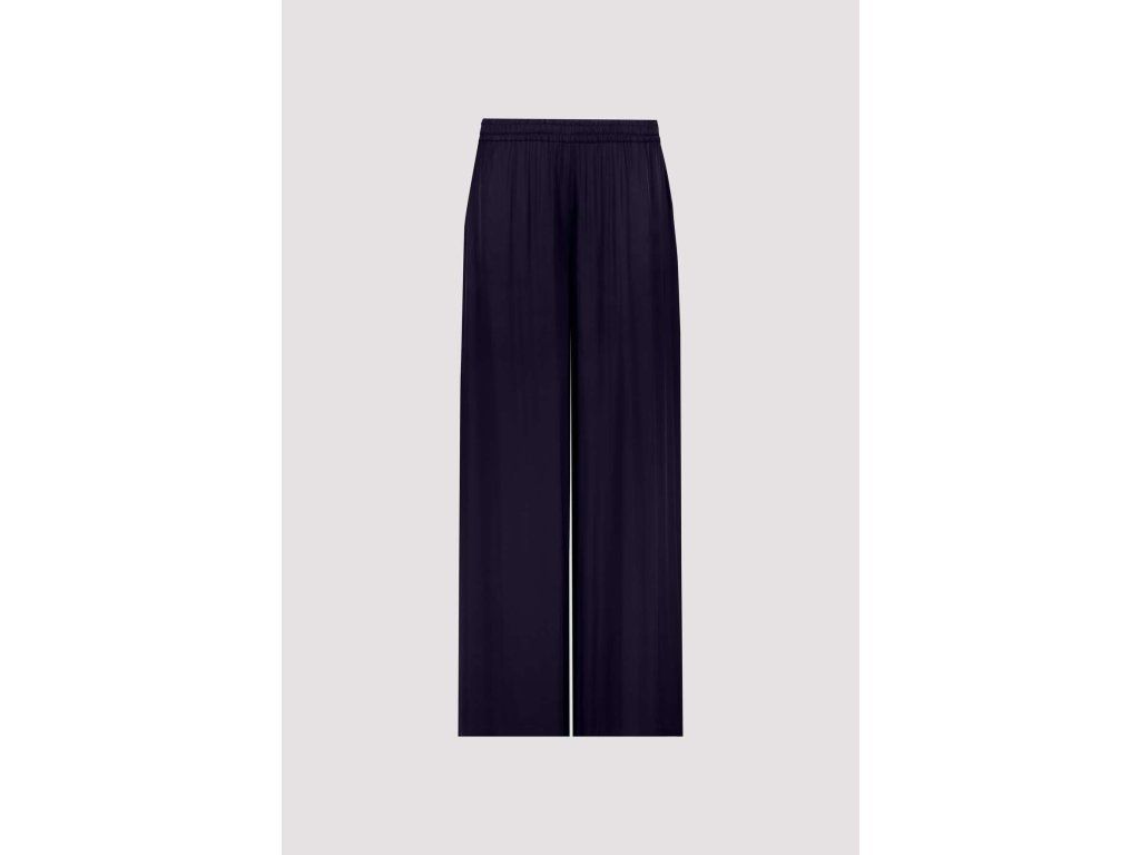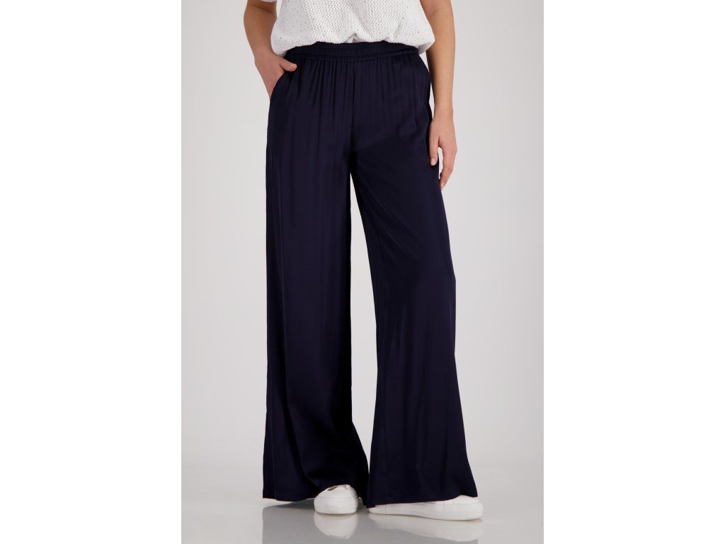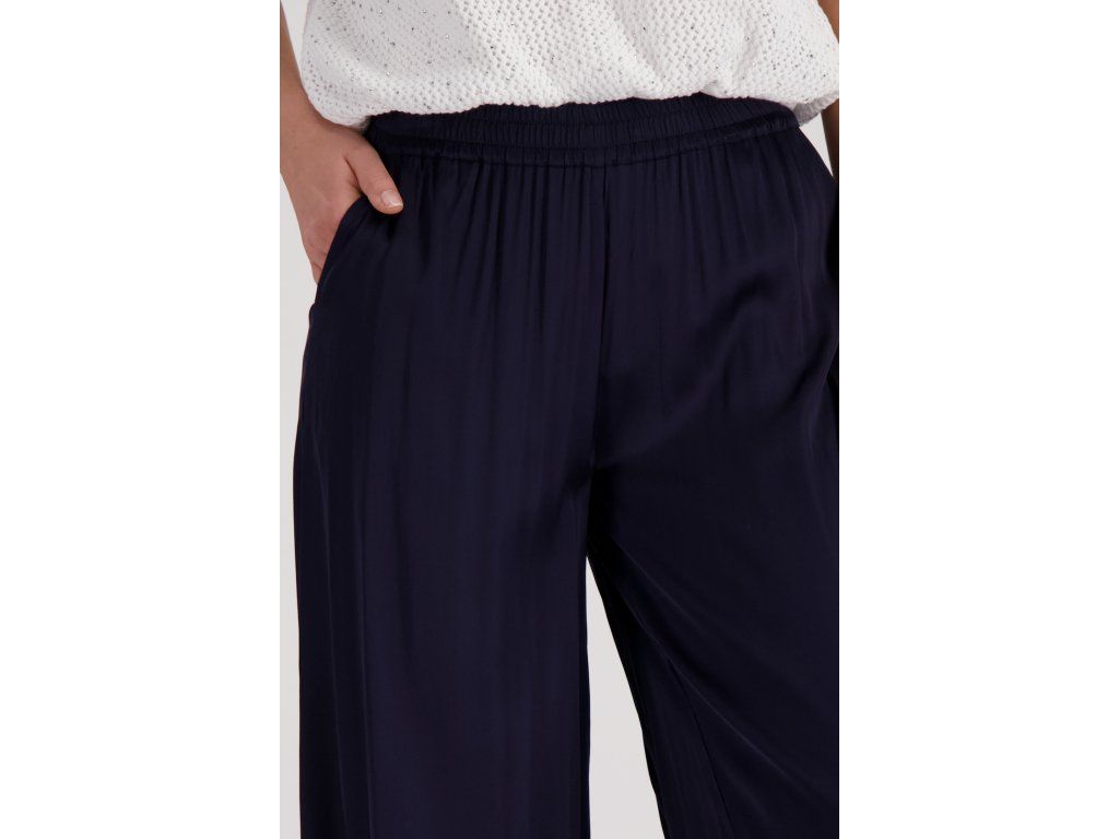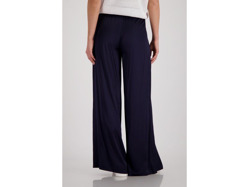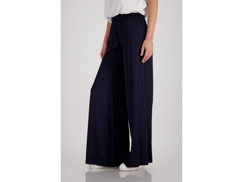 Tmavě modré široké kalhoty Monari z lehkého splývavého materiálu. Elastický pas, boční kapsy, plná délka.
