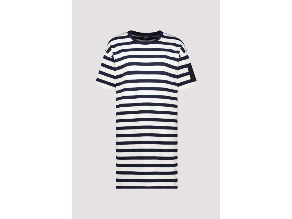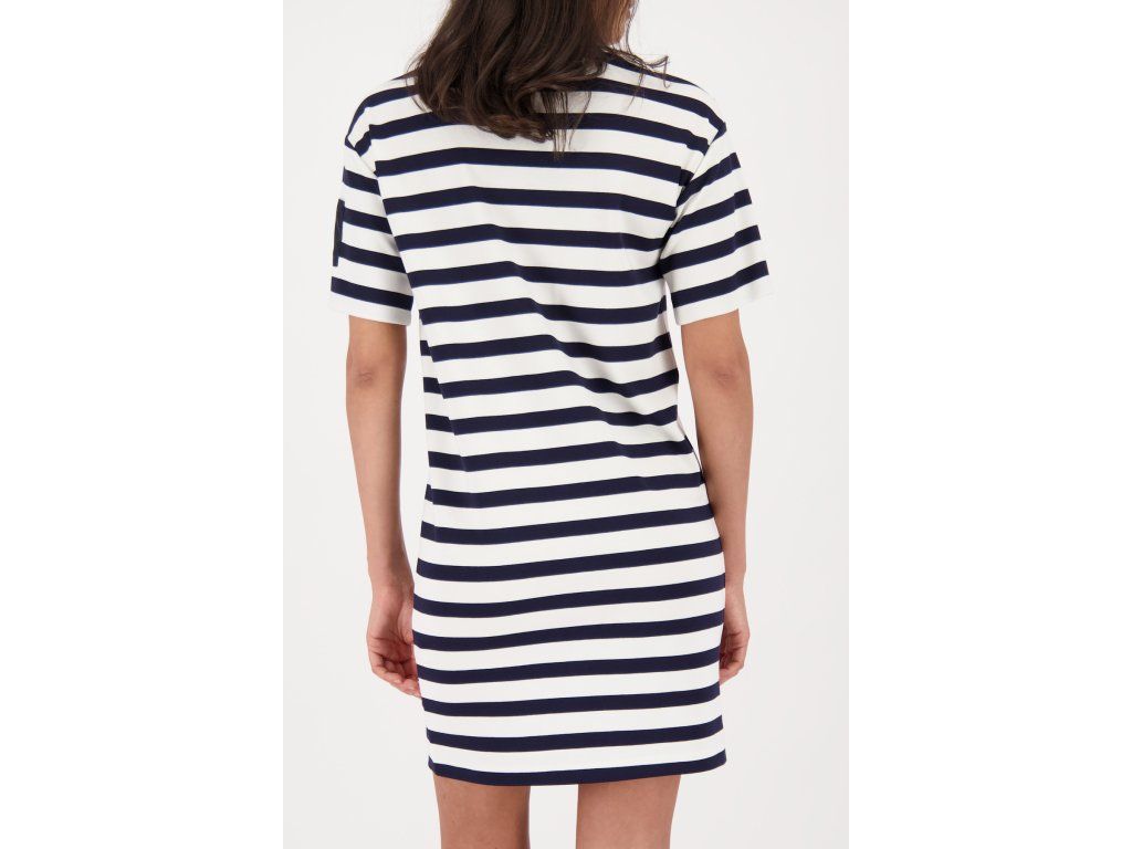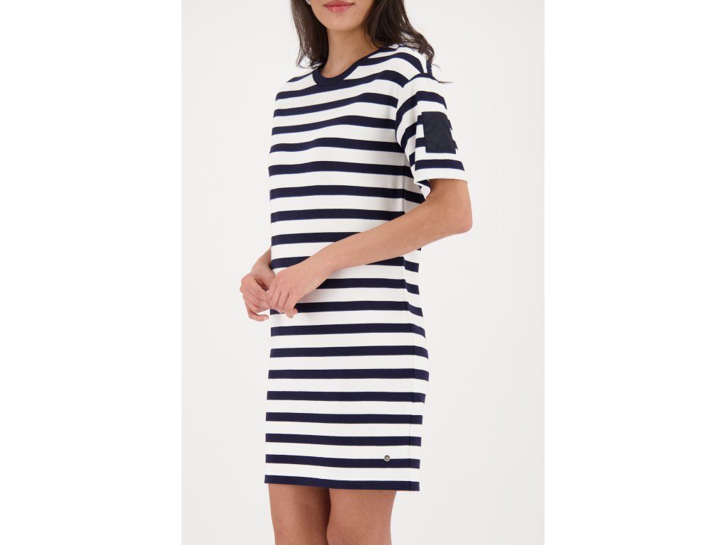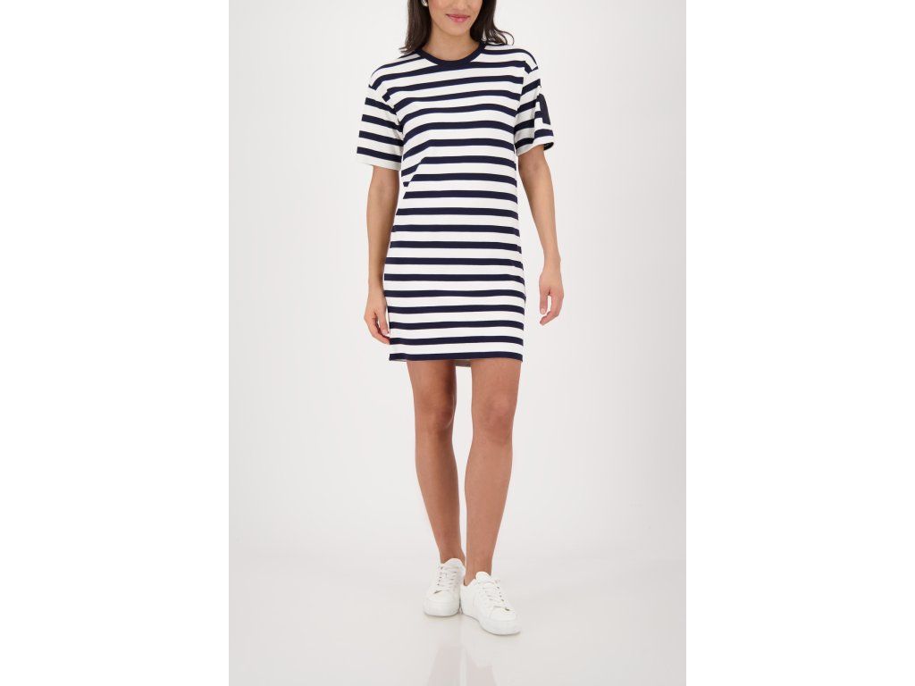 Námořnické pruhované šaty Monari ve střihu tričkových šatů. Kulatý výstřih, krátký rukáv, mini délka.