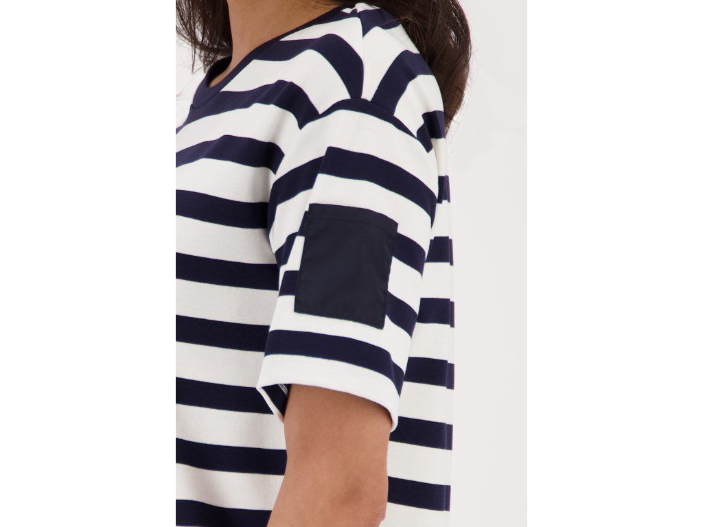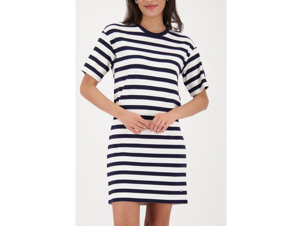Dámské šaty Monari v námořnickém vzoru — tmavě modré a bílé horizontální pruhy na pevném úpletovém materiálu. Střih je rovný tričkový s volnějším pasem, délka sahá nad kolena do mini.