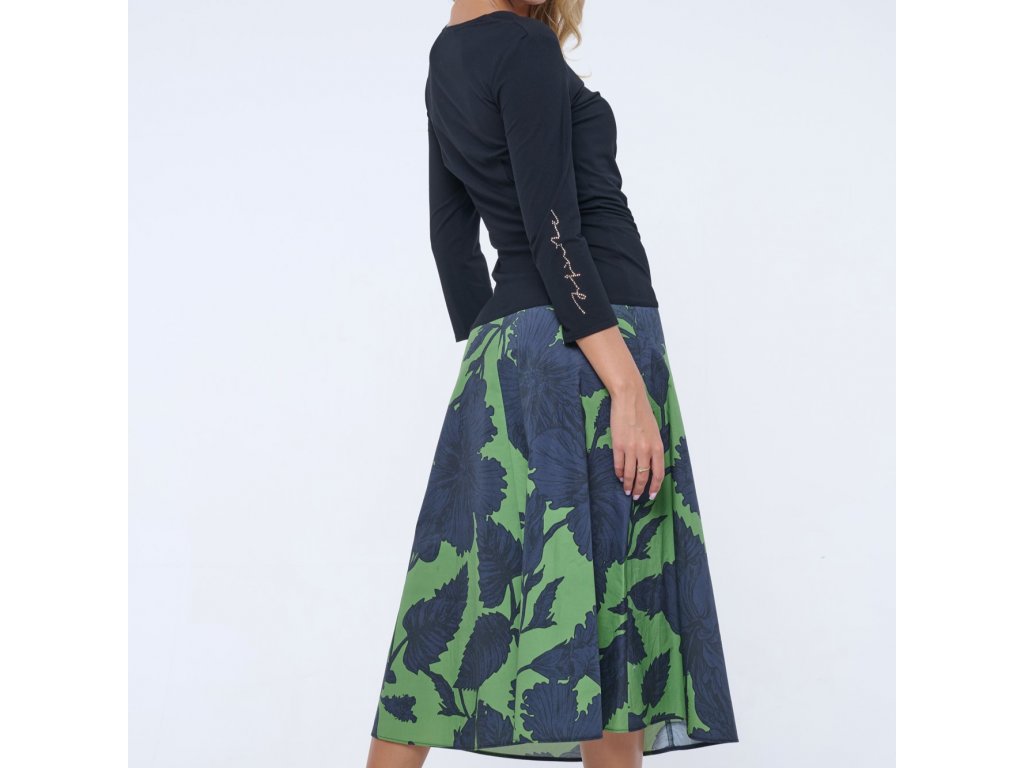 Tento šarmantní model značky Infinite je tou pravou volbou pro dámy, které chtějí působit svěže a elegantně. Tričko s dlouhými rukávy a lichotivým střihem zdobí jemné ruchování a decentní výšivka na manžetě. Sukně A-linie s propracovaným květinovým vzorem v zeleno-modré barvě dodává outfitu živost a dynamiku. Vyrobeno z kvalitního materiálu, který zaručuje pohodlí a snadnou údržbu, tyto šaty jsou ideální volbou pro každodenní nošení i speciální příležitosti.