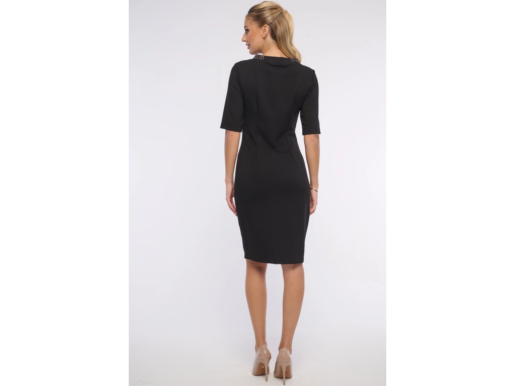 Tyto elegantní šaty značky Infinite si zamilujete na první obléknutí. Jsou ušity z velmi příjemného, pružného materiálu, který jemně obepne vaši siluetu a lichotivě vytvaruje postavu. Klasický pouzdrový střih s krátkým rukávem a délkou ke kolenům je doplněn decentním stojáčkem. Co však dělá tento model skutečným klenotem, je zdobení luxusními krystaly Preciosa. Třpytivé detaily na límci a v oblasti boků elegantně nahradí šperky a zvýrazní váš pas. Jsou to ideální společnice pro náročný den v kanceláři, ale s lodičkami v nich zazáříte i na slavnostní večeři či v divadle.