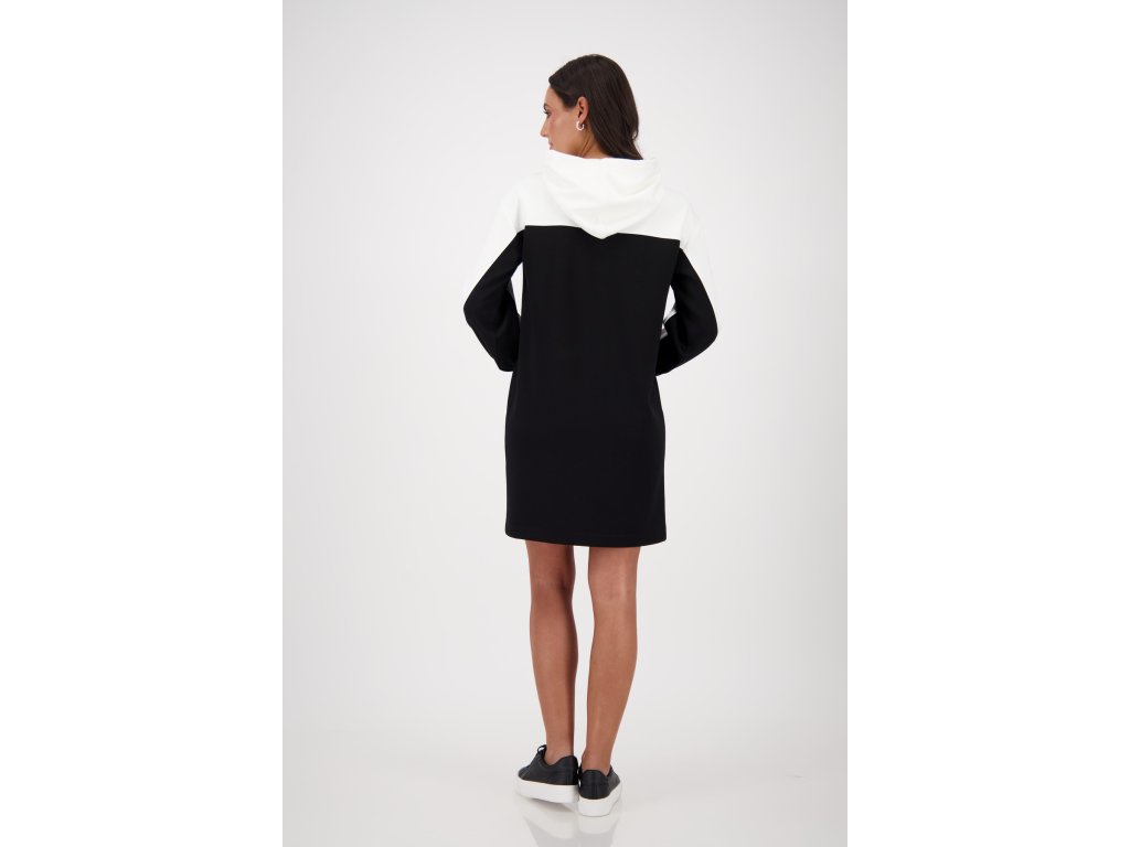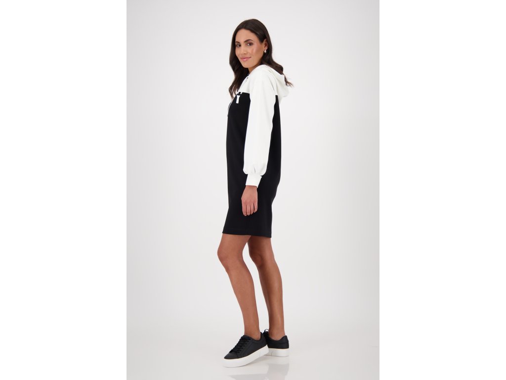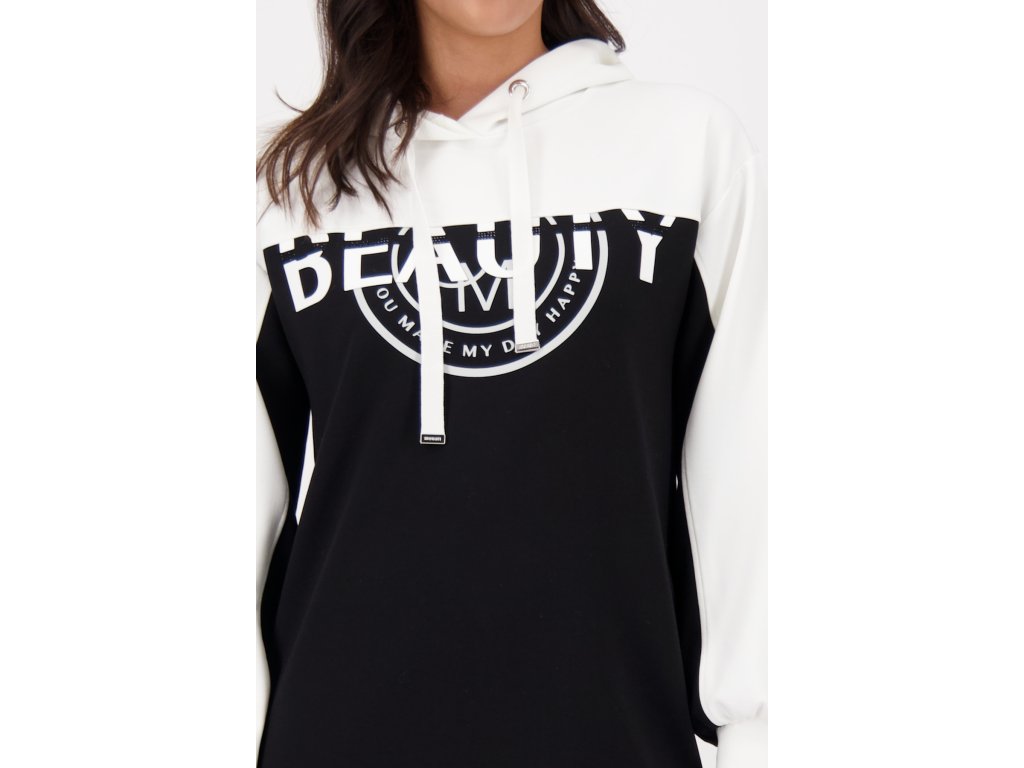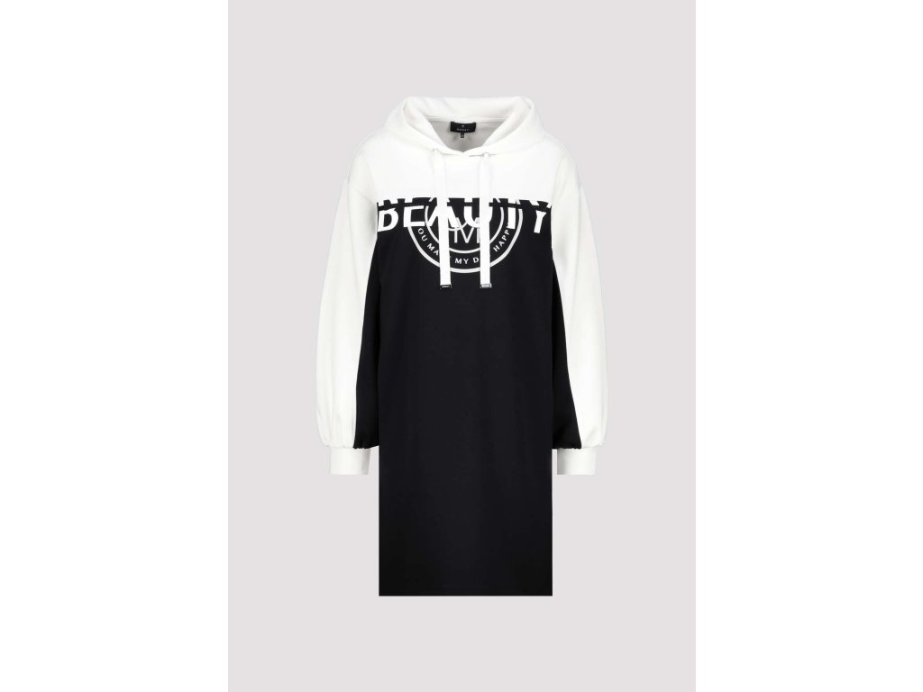 Sportovně-elegantní černé šaty Monari s kontrastní bílou horní částí a kapucí jsou skvělou volbou pro každodenní pohodlí i styl. Rovný volnější střih lichotí postavě a umožňuje volný pohyb. Měkký, příjemný materiál zajišťuje komfort po celý den. Originální potisk "BEAUTY" na hrudi dodává městský šmrnc. Skvěle se hodí k teniskám na procházky, nákupy i volné víkendy.