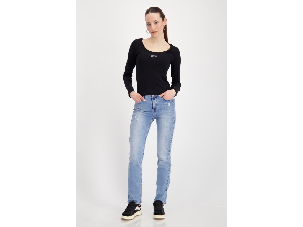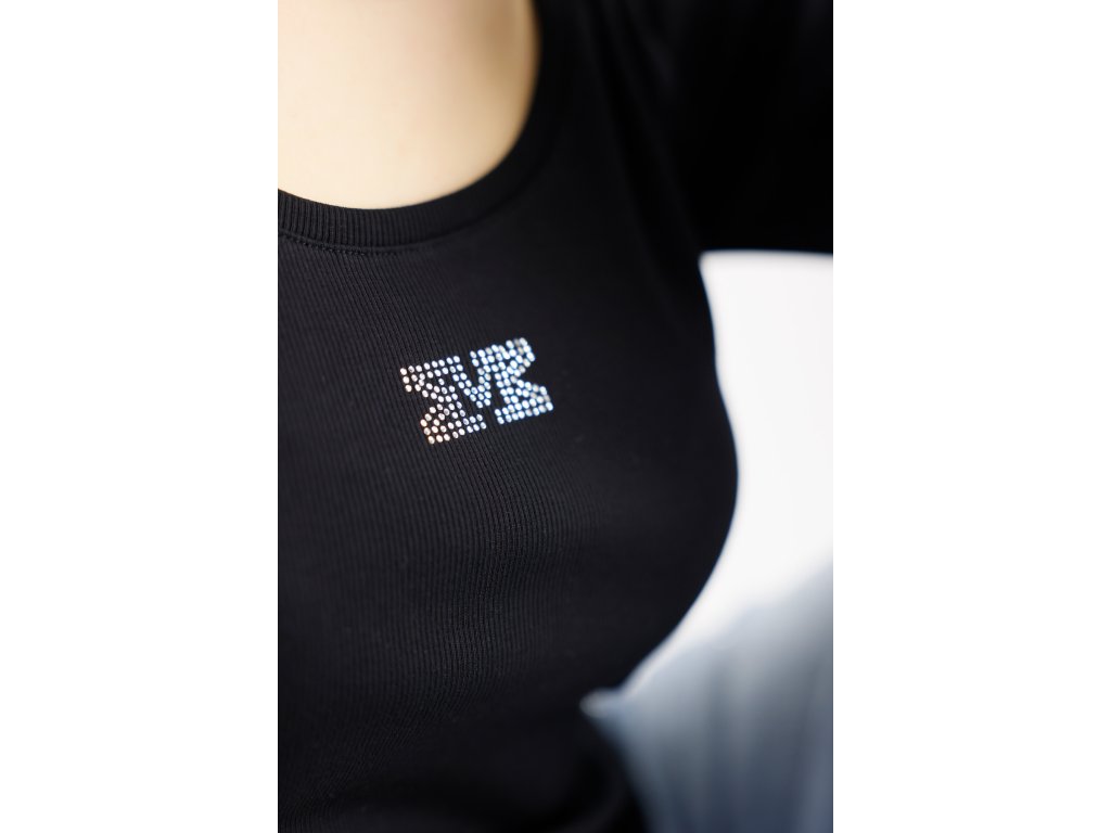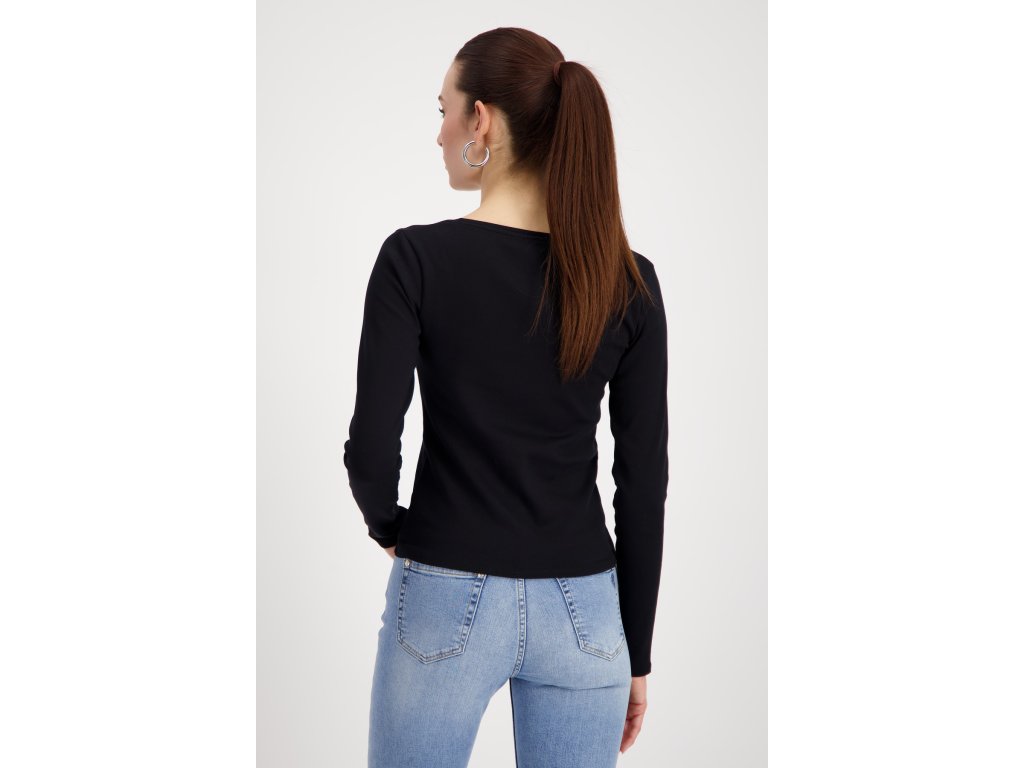 Černý svetr značky Monari zaujme jednoduchým, ale velmi ženským střihem s kulatým výstřihem a dlouhými rukávy. Díky pružnému žebrovanému materiálu krásně sedí na postavě a přizpůsobí se tvarům. Středový nápis z drobných kamínků dodává elegantní šmrnc a jemný lesk. Tento kousek se hodí jak k džínům na běžné nošení, tak i k elegantním kalhotám či sukni na večerní příležitosti.