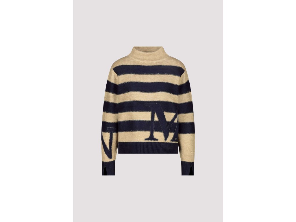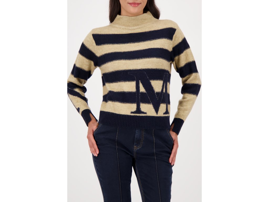 Pruhovaný svetr Monari v námořnické modři a béžové s velkým písmenem „M“ dodá šmrnc každému outfitu.