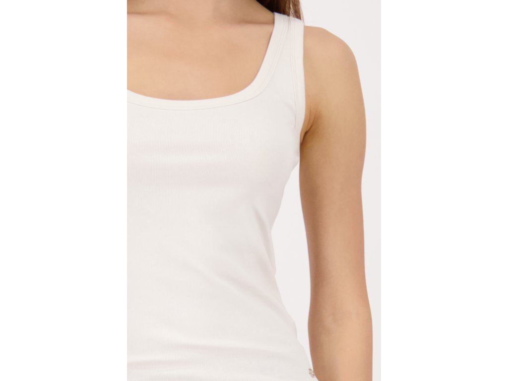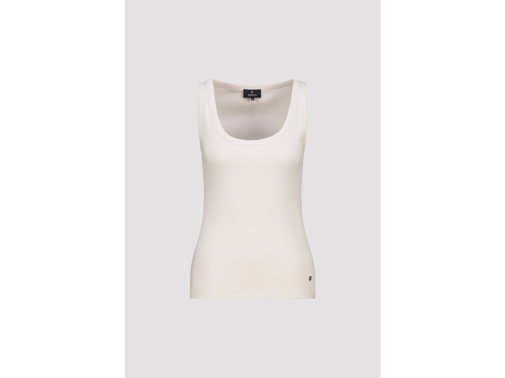Hledáte dokonalý základ šatníku? Tento žebrovaný top Monari v barvě champagne s jemným logem krásně sedí a doplní kalhoty i sako.