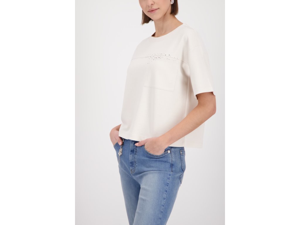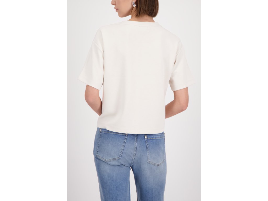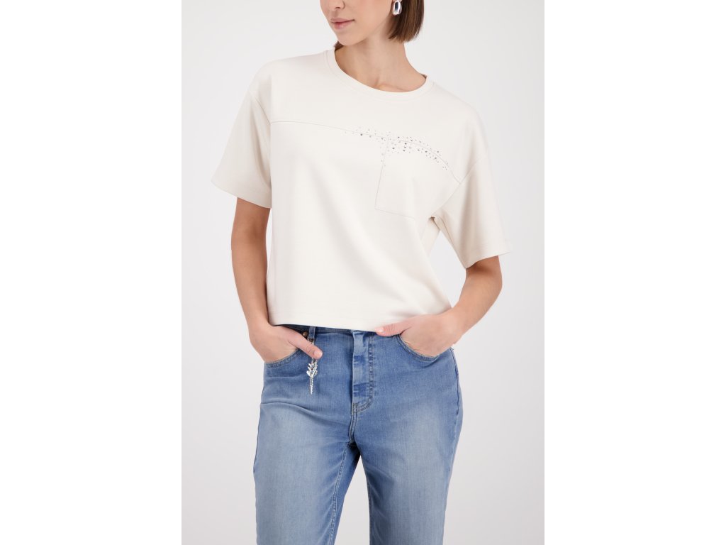 Oživte svůj šatník s tímto šik tričkem Monari v barvě champagne! Volnější střih a třpytivý nápis Ciao z kamínků vám dodají italský šmrnc každý den.