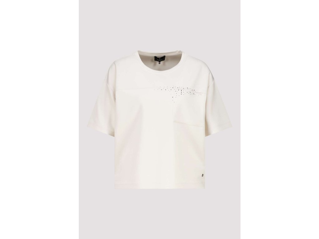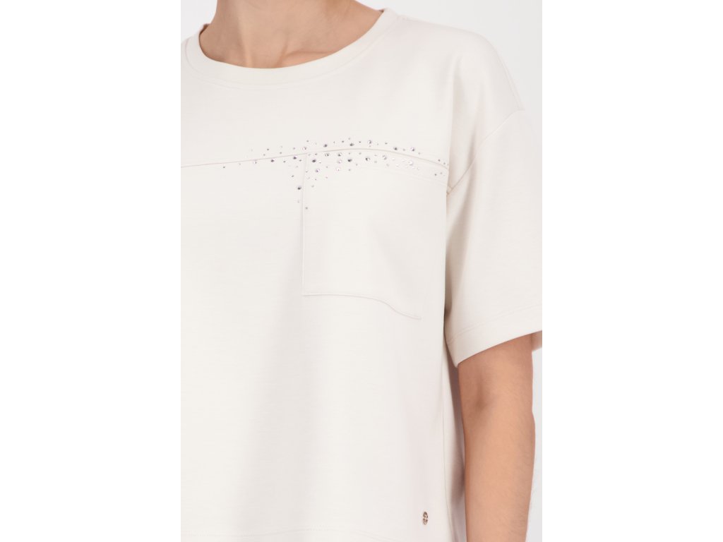 Tričko má úžasně pohodlný, lehce volnější krabicový střih s padlými rameny, který nikde zbytečně neobepíná a chytře schová i drobné nedokonalosti. Splývavý, na dotek velmi hladký a kvalitní materiál zaručí, že se budete cítit jako v bavlnce od rána do večera. Co z něj ale dělá opravdový klenot, je náprsní kapsička a jemný, třpytivý nápis "Ciao" vyskládaný z drobných kamínků. Vypadá naprosto fantasticky v kombinaci s klasickými modrými džínami a teniskami pro pohodový den, ale skvěle ho vynosíte i zakasané do elegantnější sukně.