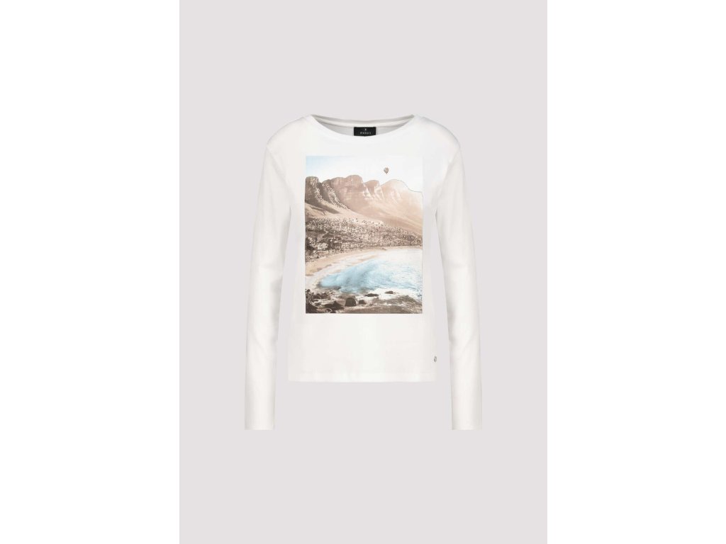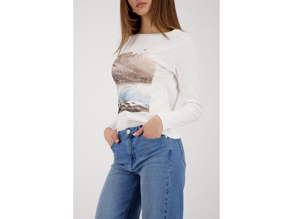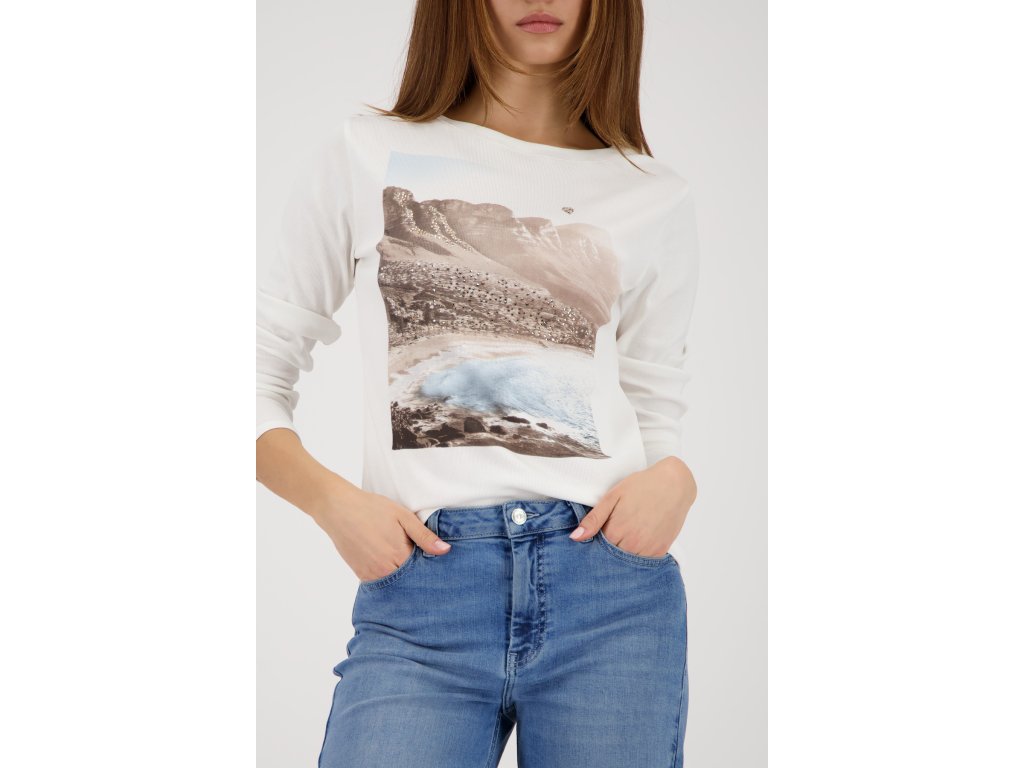 Toužíte po kousku, který vás v myšlenkách přenese na slunnou pláž? Toto bílé triko značky Monari s dlouhým rukávem je víc než jen obyčejný základ šatníku. Na první pohled vás upoutá nádherným fototiskem pobřežní krajiny na přední straně, který je mistrně dozdoben třpytivými štrasovými kamínky. Ty dodávají motivu hloubku a elegantní odlesk při každém pohybu.