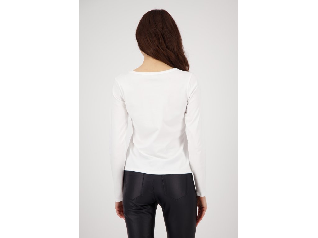 Bílé dámské triko Monari s dlouhým rukávem je vyrobeno z příjemného materiálu s jemným leskem a skvělou elasticitou. Rovný střih zajišťuje pohodlí při nošení, zatímco kulatý výstřih lichotí postavě. Přední stranu zdobí nápis "MAGIC WILD LIFE" s efektním motivem leoparda vytvořeným z drobných kamínků. Ideální k džínám i elegantnějším kalhotám – do práce i na volný čas.