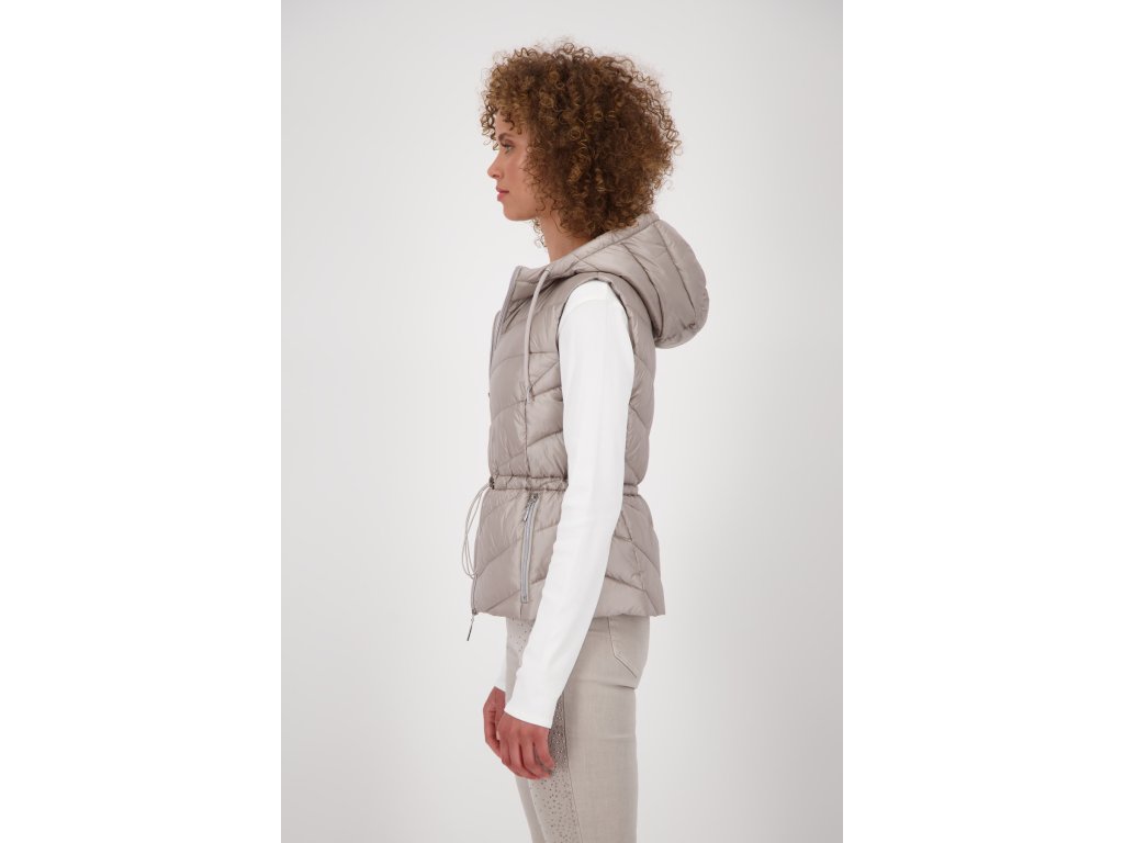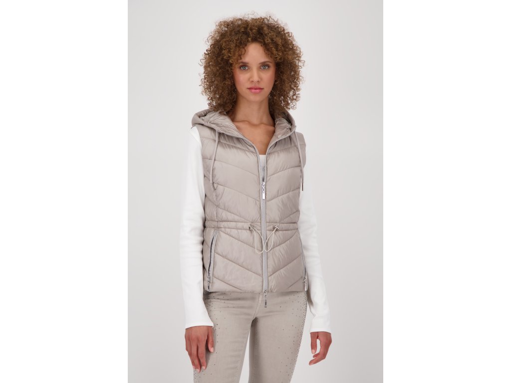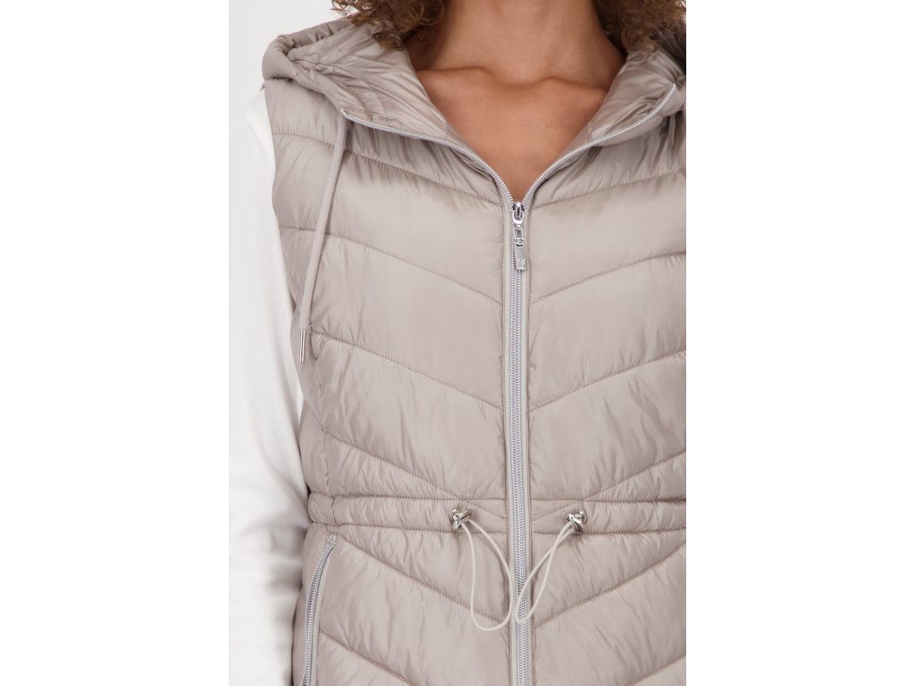 Lehká, ale hřejivá vesta Monari v béžové barvě zaujme stylovým prošíváním a funkční kapucí. Praktické stahování v pase krásně zvýrazní siluetu, zatímco dvoucestný zip a kapsy na zip zajišťují pohodlí i praktičnost. Lesklý materiál dodává moderní vzhled. Perfektní na jarní nebo podzimní dny – přes mikinu, svetr i lehkou bundu.